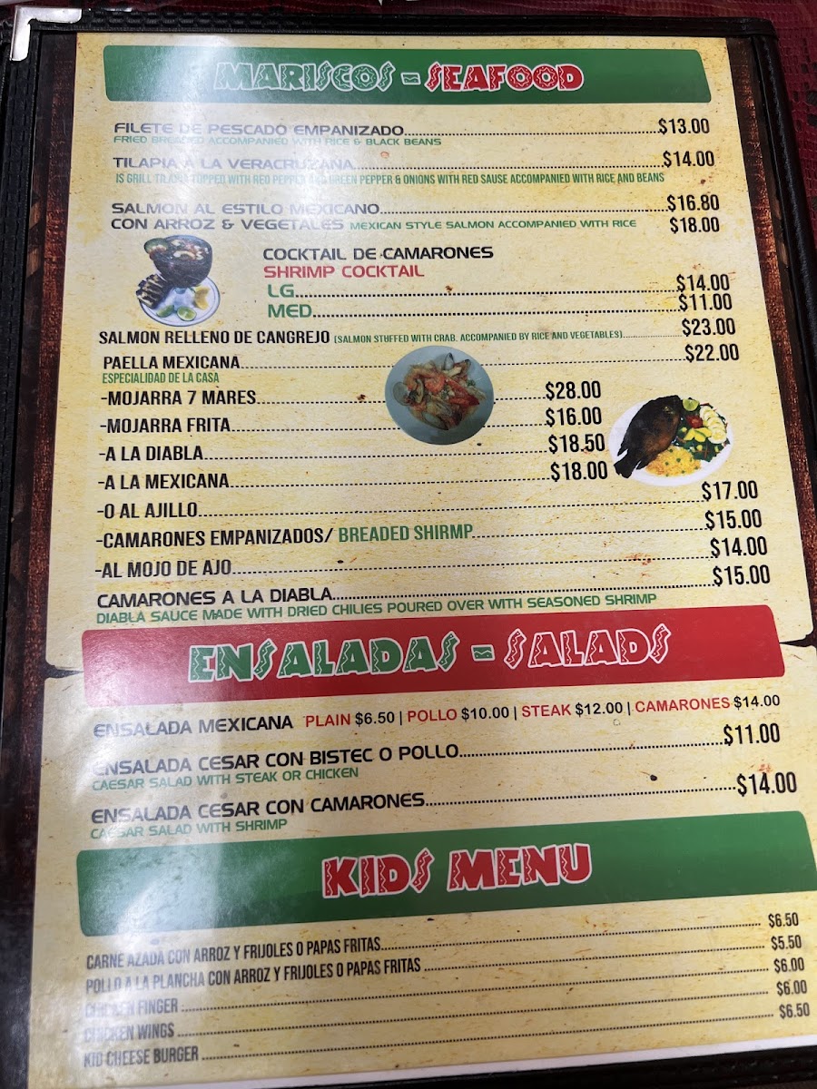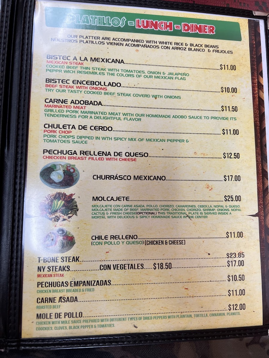 For a more substantial meal, explore the Platillos Mexicanos section. Each dish is served with rice and beans, providing a complete and balanced meal. Popular options include Bistec a la Mexicana, Bistec Encebollado, Carne Adobada, Chuletas Fritas, and Chuletas a la Mexicana. These are hearty dishes packed with rich flavors, perfect for those looking for a satisfying traditional Mexican meal.