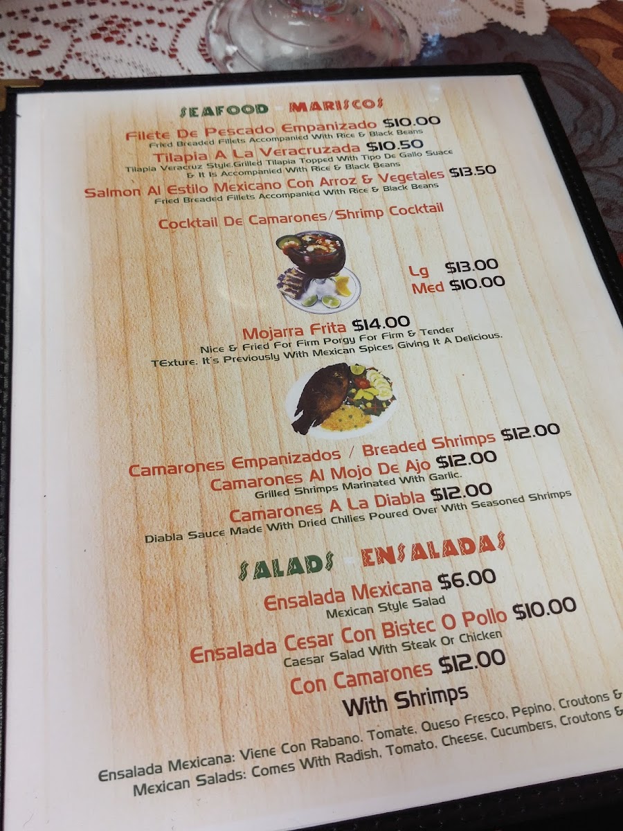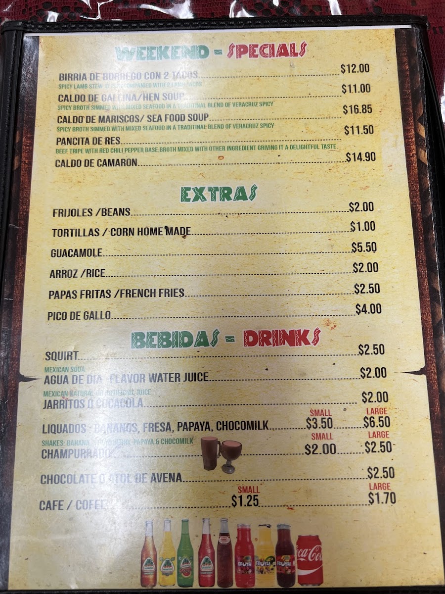 Seafood lovers will appreciate the Mariscos/Seafood options, including a variety of flavorful broths like Caldo de Marisco, Caldo de Mojarra, Caldo de Mojarra con Camarones, Caldo de Pescado con Camarones, and Caldo de Camarones. Each soup is served with rice, tortillas, chopped cilantro, and onions, adding a fresh and aromatic touch to the rich, savory flavors of the seafood.
