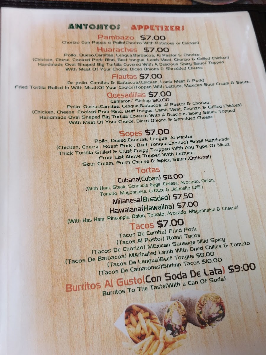 If you're in the mood for a filling sandwich, the Tortas are an excellent choice. Each comes with a side of crispy papas fritas (fries). Options include the Torta con Milanesa de Res, Torta Hawaiana, Torta Cubana, Torta con Huevo y Chorizo, and Torta de Milanesa de Pollo. These sandwiches offer a great mix of flavors and textures, from crispy bread to savory meats and toppings.
